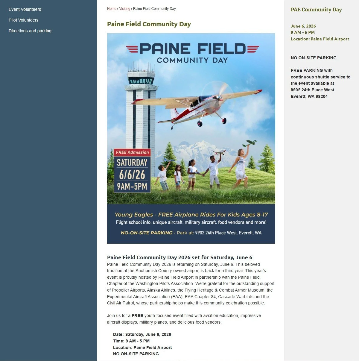 Back to All Events Paine Field Community Day Saturday, June 6, 2026 9:00 AM 4:00 PM Paine Field Airport 9902 24th Place West Everett, WA, 98204 United States (map) Google Calendar ICS